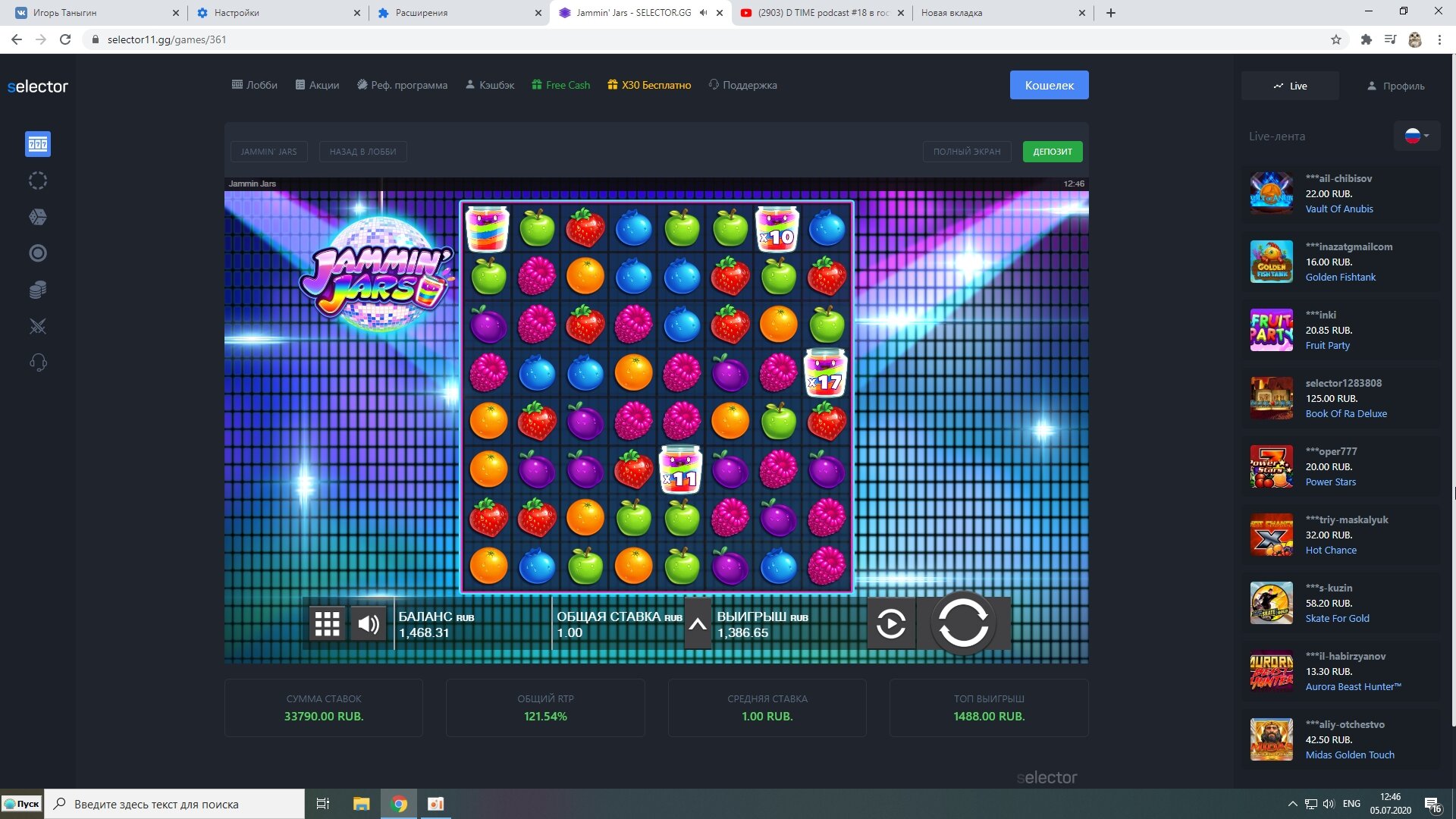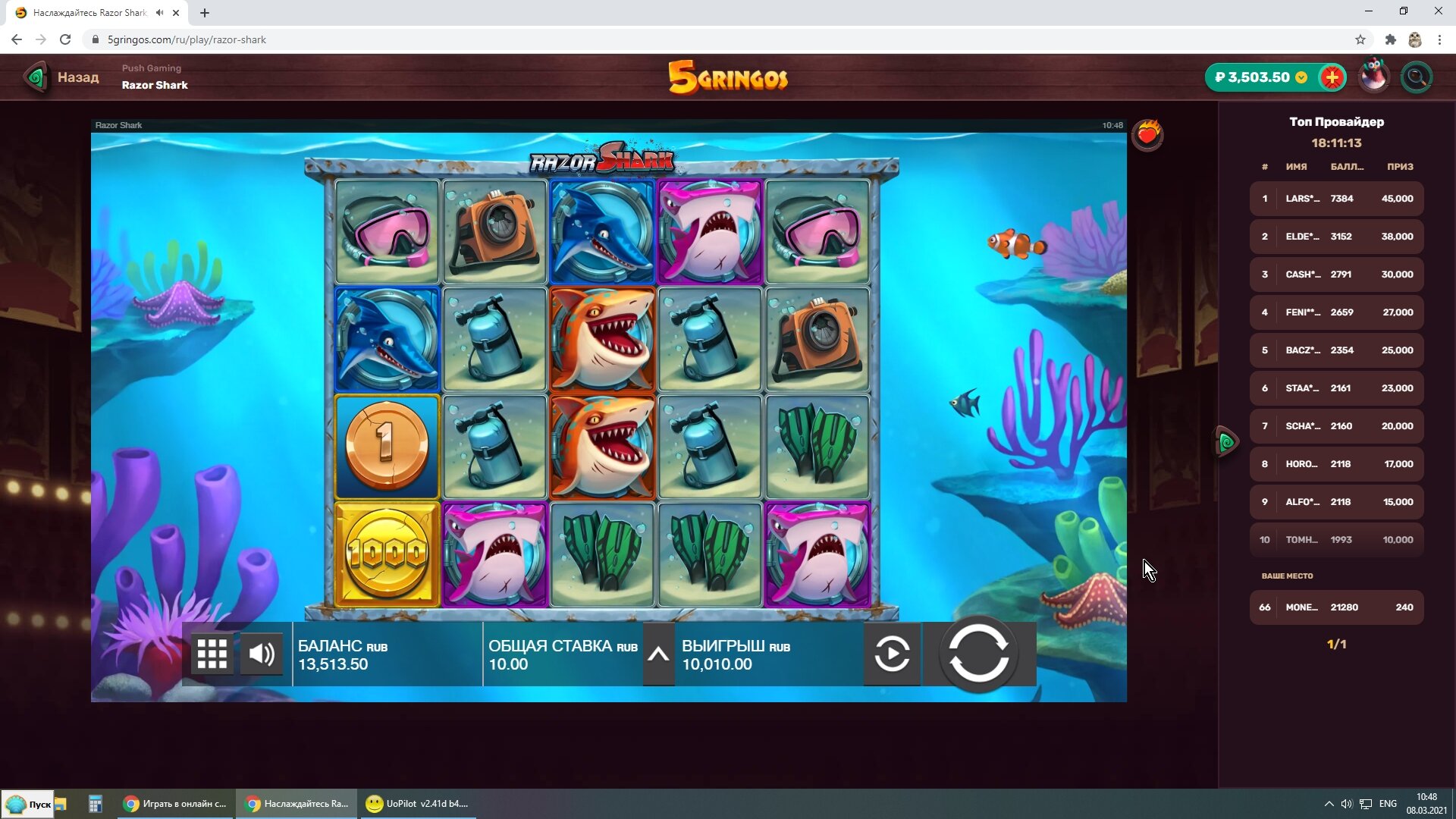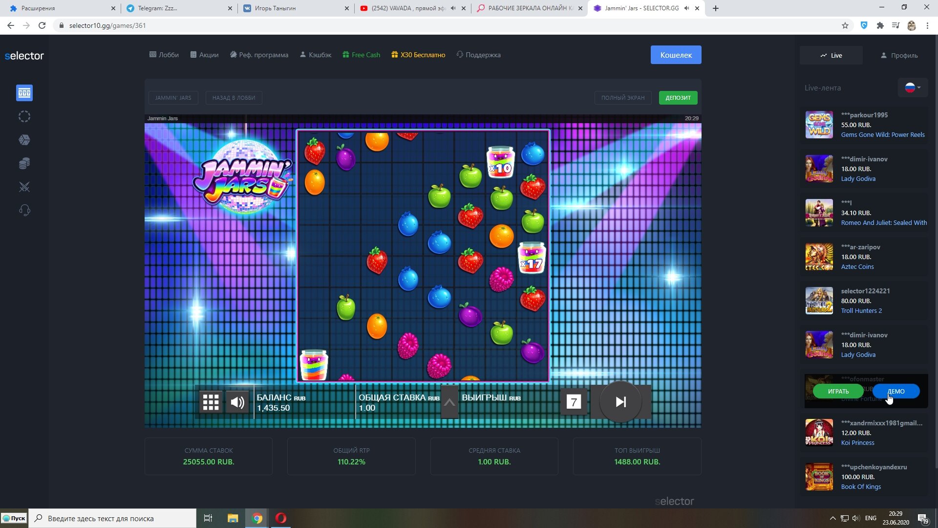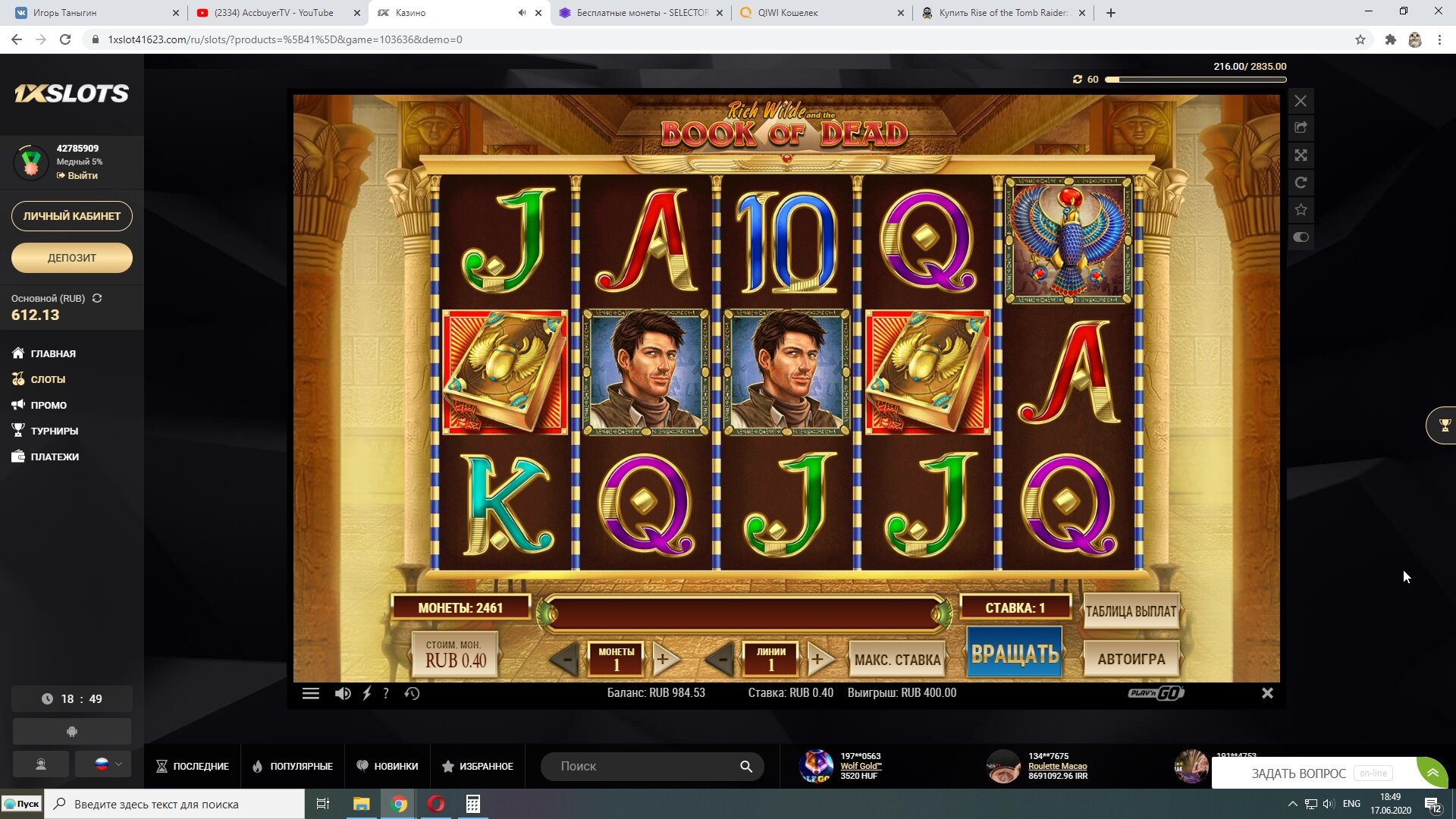 Вот наглядный пример как я делаю плюс в казино.Сегодня нашел новое казино WINOTA. Пополнил через экопейз 800 рублей. И зашел в RAZOR SHARK.На балансе оставалось около 200 рублей получаю существенный плюс за счет монет.Следующие мои действия сохранить без больших потерь баланс и вывести. А так как получил выигрыш после примерно спинов на сумму 500 рублей, то вычисляю что при депозите 800 рублей мне нужно ставок на 2400.На 500 рублей я уже сделал ставки.Остается всего 1900 рублей.Правильное решение идти в низкодисперсионный слот и отмыть вагер х3 на депозит.Дальше напишу итоги отмыва.