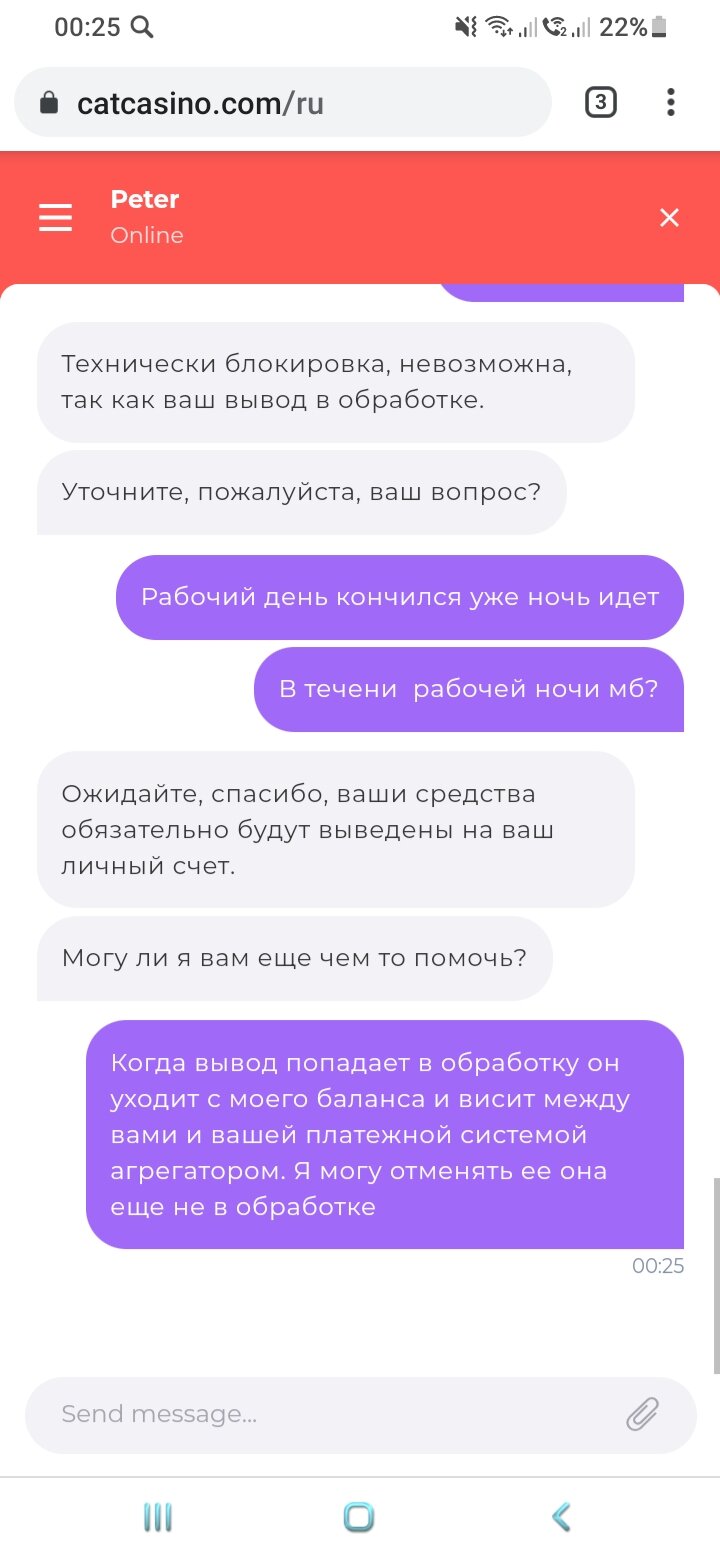 Да он скорее всего на форуме не появится, это была разовый заход.., а КЭТ казино выполнила свои правила и вывела выигрыш в течении 24 часов