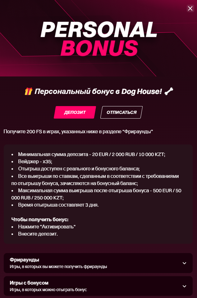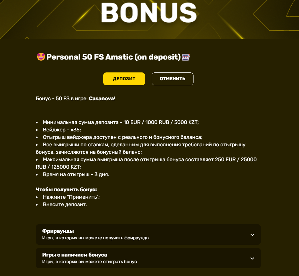 Мне они как то были персональный бонус на 10000р зачислили и мин депозит 3 евро для получения. Вагер х20 и макс сумма вывода 50000р. До сих пор жалею что не получил этот бонус