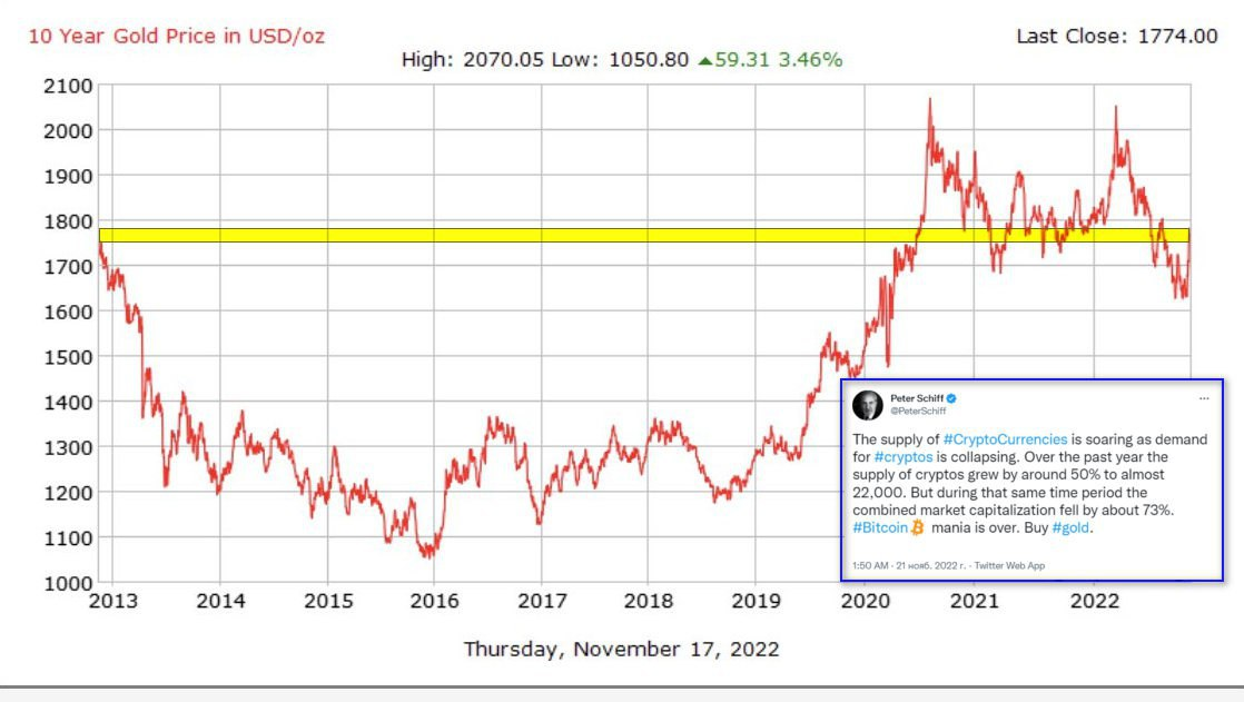 Мы же просто вспомним, что золото 10 лет назад стоило $1800 за тройскую унцию. Это ровно столько же, сколько оно стоит и сегодня
