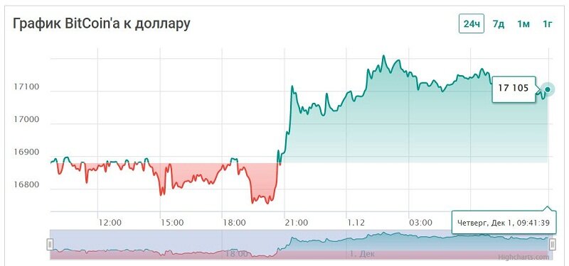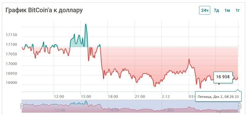 Биткоин (BTC), по данным ресурса CoinMarketCap, начал декабрь с небольшой коррекции. По состоянию на 06:19 (МСК), криптовалюта торгуется по $17 153 (1 токен в рублях – ₽1,045,149). Минимум биткоина за 24 часа – $16 755, максимум – $17 194.