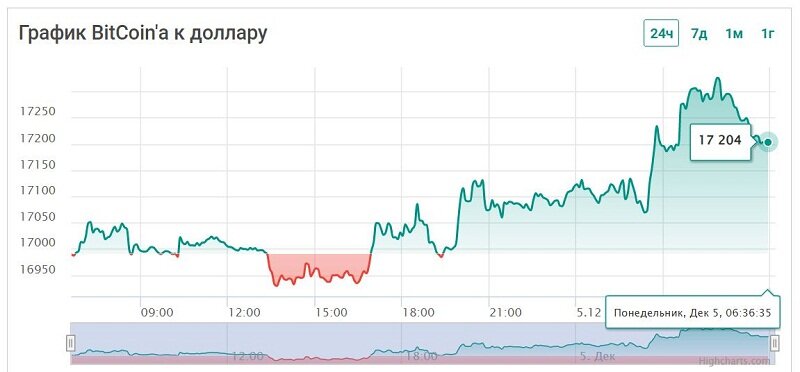 Утром 5 декабря цена биткоина обновила максимум с 11 ноября, достигнув отметки $17,4 тыс. По состоянию на 9:55 мск первая криптовалюта торгуется на уровне в $17,3 тыс., за прошедшие сутки она подорожала на 1,7%.