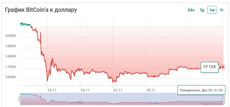 Рост котировок возобновился вслед за ралли фондовых индексов и ослаблением доллара на Форекс. «Американец» обвалился после выступления главы ФРС США Дж. Пауэлла. Он заявил, что на декабрьском заседании ЦБ может замедлить темпы повышения ставок. К концу рабочей недели курс биткоина восстановился до $17,3 тыс. и стабилизировался в диапазоне $16,7-17,2 тыс.