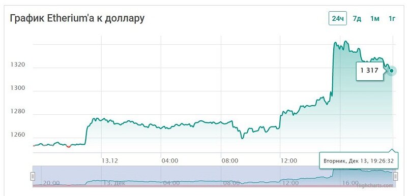 Тем временем ETH, нативный коин блокчейна Ethereum, пытается двигаться в тандеме с BTC. Цена росла с 21 ноября, но сначала никак не могла прорвать область сопротивления $1 290, несмотря на несколько попыток штурма.