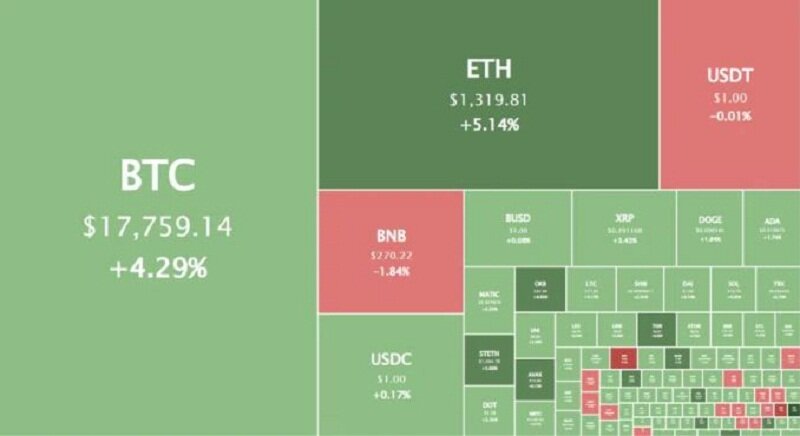 За прошедшую неделю курс биткоина вырос на 4%, до $17672, стоимость эфира показала рост на 4.6%, до $1312. За последние сутки показали рост в пределах от 1% до 3% Ripple (XPR) — $0.39; DOGE— $0.089; ADA— $0.309; MATIC— $0.921; DOT— $0.921 и еще девять криптоактивов из первой двадцатки по уровню рыночной капитализации.