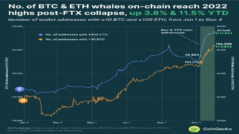 Аналитики СoinGecko сообщают, что крах биржи FTX повлек прирост числа крупных держателей активов в сетях Биткоина и Эфириума. Темпы роста увеличились в четыре раза по сравнению со среднегодовыми показателями.