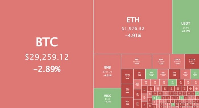 Курс биткоина обвалился до $29 тыс. на криптовалютных биржах. В течение получаса на крупных площадках актив потерял в цене более $1 тыс., опустившись с отметок около $30,1–30,2 тыс.