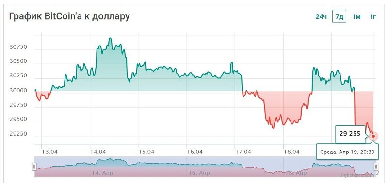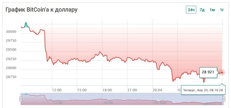 20 апреля курс биткоина опустился ниже $29 тыс. Стоимость актива снизилась до отметки в $28,7 тыс., обновив минимум за 10 дней. За прошедшие сутки BTC подешевел на 3,9%. По данным CoinGecko, на 9:20 мск биткоин торгуется на уровне $29 тыс.