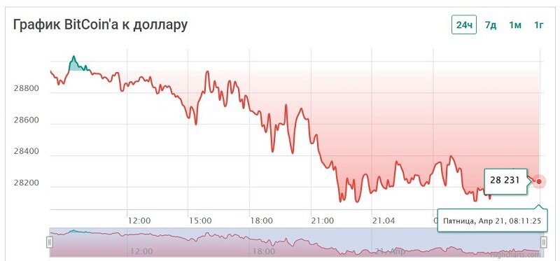 21 апреля курс биткоина опустился ниже $28 тыс. Цена актива падала до отметки $27,9 тыс. По данным CoinGecko, на 14:00 мск BTC торгуется на уровне $28 тыс., за сутки он подешевел на 2,8%.