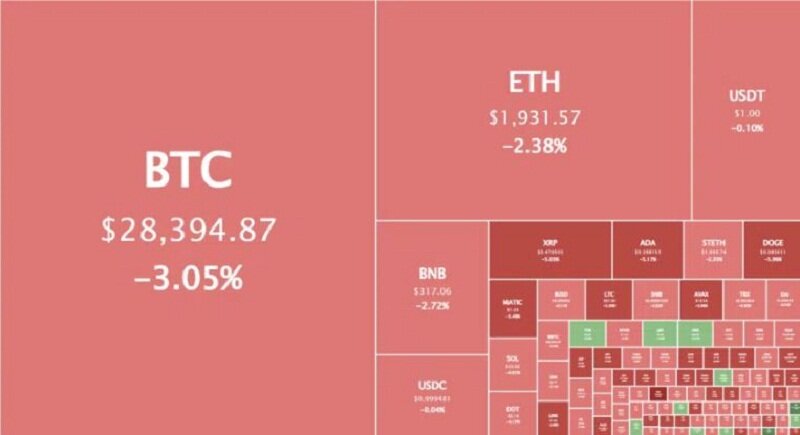 На Binance BTC подешевел ровно до 29 тыс. USDT, на Coinbase опустился почти до $29 тыс., на OKX — до 28,9 тыс. USDT, на Bybit показал 29 001 USDT, на Huobi опускался в моменте до 29 002 тыс. USDT, на CoinEx — ровно до 29 тыс. USDT.