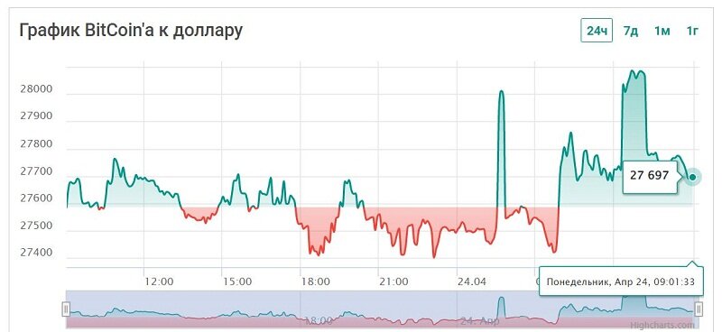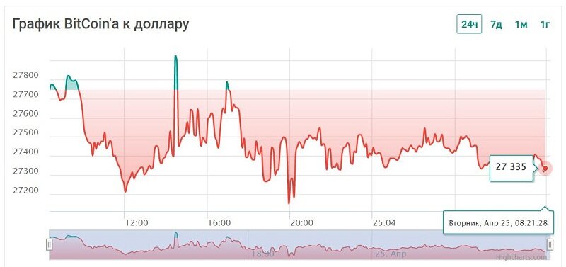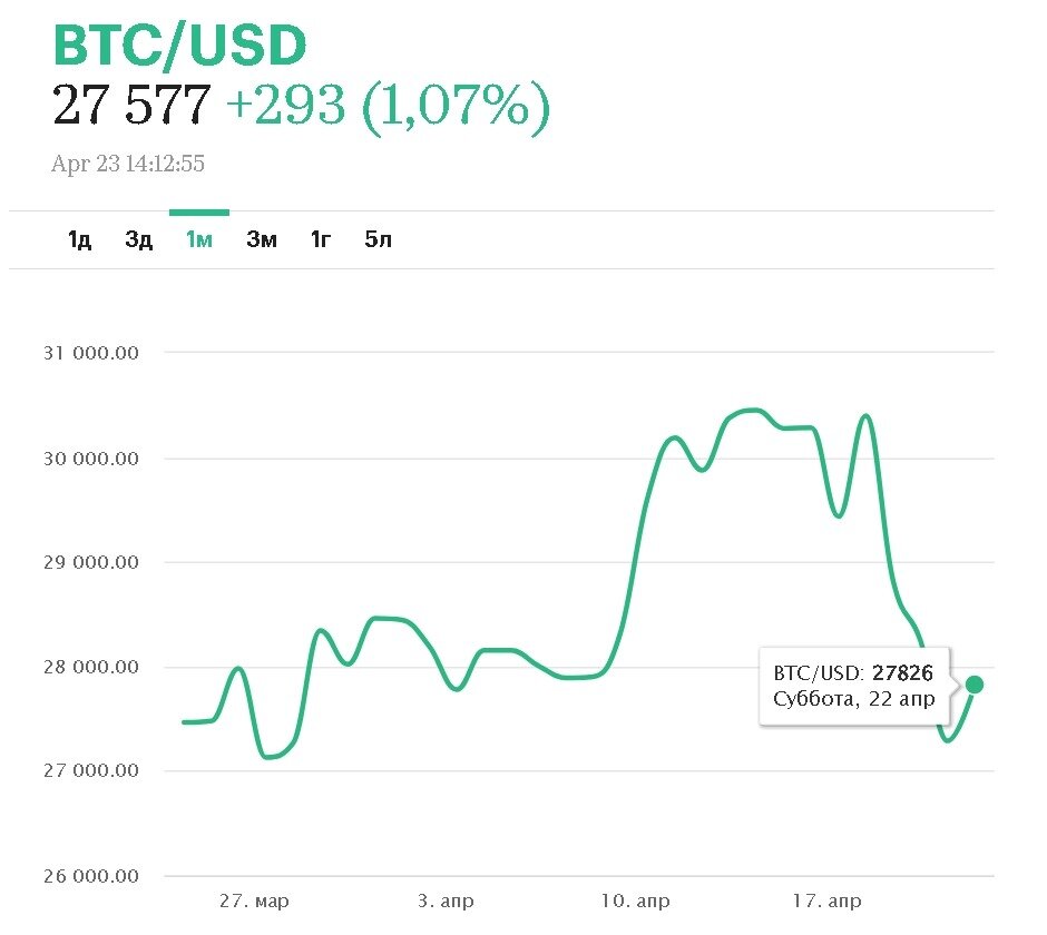 Текущий курс биткоина к доллару — $27,711.00