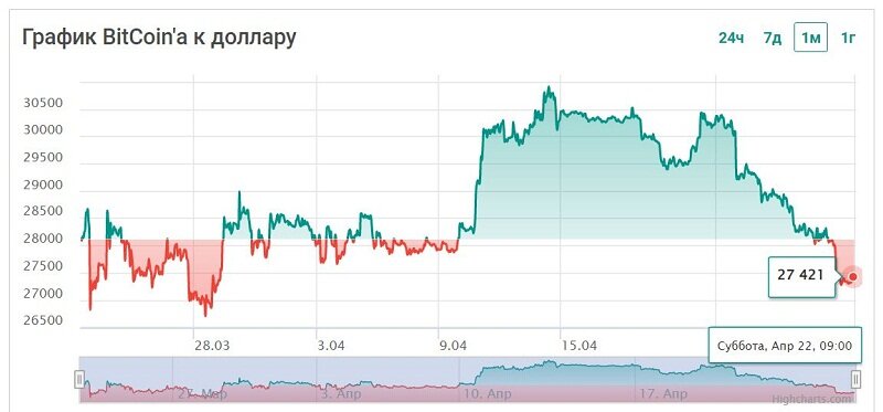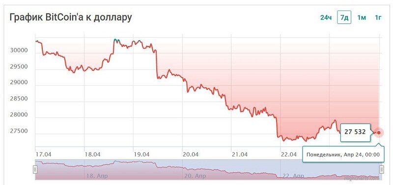 За неделю с 14 по 21 апреля биткоин потерял в цене почти 7,5%, снизившись с $30 498 до $28 220. Пять из семи дней первая криптовалюта мира закончила в красной зоне. Самое большое падение было зафиксировано в среду, 19 апреля, когда BTC потерял сразу более 5%.