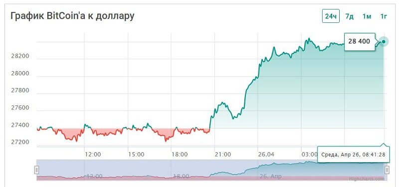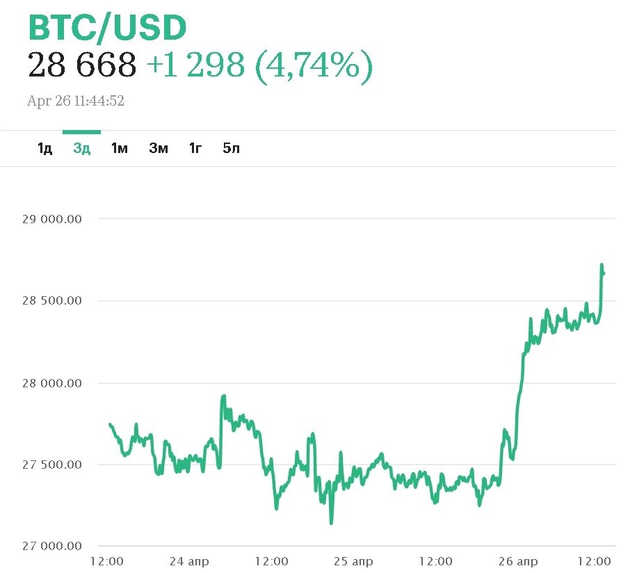 Стоимость первой криптовалюты вновь поднялась выше $28 тыс.