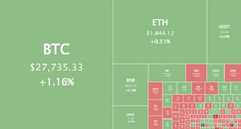 Биткоин (BTC), по данным ресурса CoinMarketCap, начал новую рабочую неделю со вспышки роста. По состоянию на 06:14 (МСК), криптовалюта торгуется по $27 736 (1 токен в рублях — ₽2,258,014). Минимум биткоина за 24 часа — $27 400, максимум — $27 979.
