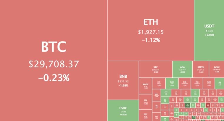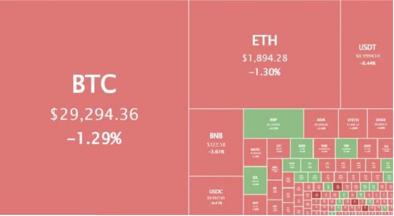 Однако медведи перехватили движение и не допустили дальнейшего роста. Наоборот, BTC откатился на несколько сотен долларов и остановился на уровне чуть более 29,000 XNUMX долларов.