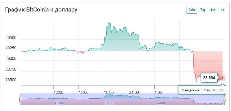 Биткоин (BTC), по данным ресурса CoinMarketCap, начал май с падения. По состоянию на 06:50 (МСК), криптовалюта торгуется по $28 576 (1 токен в рублях — ₽2,298,298). Минимум биткоина за 24 часа — $28 447, максимум — $29 952.