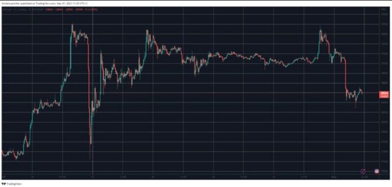 Массовая волатильность произошла в среду и четверг на прошлой неделе, когда основная криптовалюта взорвалась с 27,000 30,000 до 30,000 XNUMX долларов, прежде чем она вернулась к прежним часам спустя из-за фейковых новостей. Однако по мере того, как проблемы First Republic усугублялись, а ложные сообщения были опровергнуты, BTC снова перешел в наступление и приблизился к XNUMX XNUMX долларов.