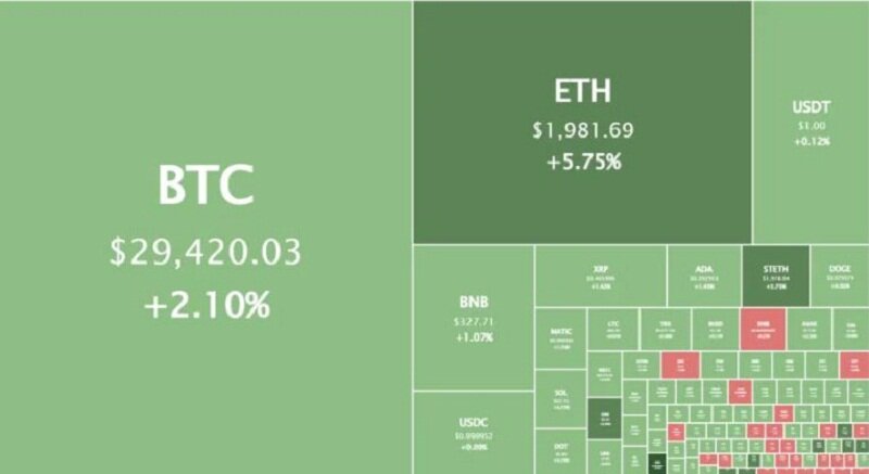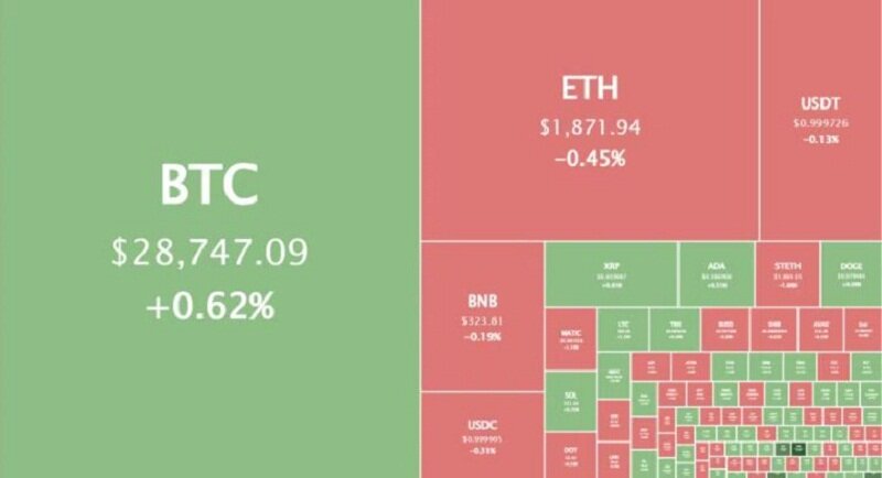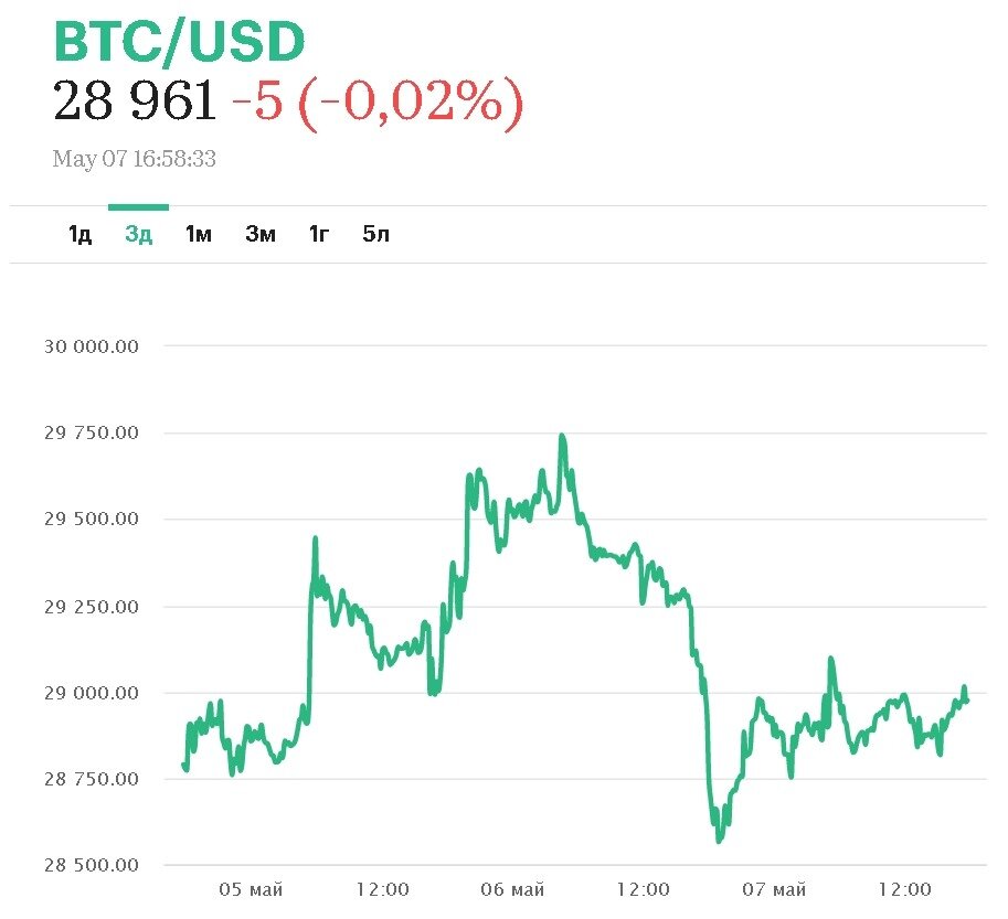 На момент написания в воскресенье ВТС торговался, по данным аналитического ресурса CoinMarketCap, в районе $29 000, с внутринедельным понижением на 2,7%.