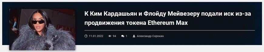 Инвестор подал иск к Ким Кардашьян и Флойду Мейвезеру из-за их участия в продвижении токена Ethereum Max (EMAX). По утверждению истца, звезды вступили в сговор с организаторами проекта ради подъема цены токена, покупатели которого впоследствии стали держателями во много раз обесценившегося актива.