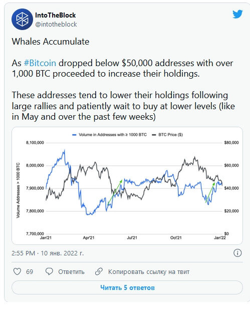 Крупные держатели биткоина (владельцы более 1 тыс. BTC) начали активно накапливать криптовалюту после того, как ее стоимость упала ниже $50 тыс. На это указывают данные аналитического сервиса IntoTheBlock. По информации аналитиков, в подобные фазы активного накопления «киты» входят в периоды глубоких коррекций, когда цена актива находится на минимальных значениях.