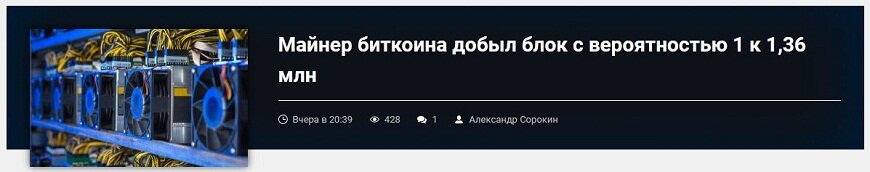 В январе одиночный майнер успешно добыл блок биткоина и получил вознаграждение в 6,25 BTC (свыше $270 тыс.) На тот момент доля майнера в общем объеме вычислительных мощностей составляла лишь 0,000073%, что означает вероятность успешного добавления блока 1 к 1,36 млн. Также майнер получил комиссии за транзакции, которые на этом блоке составили около 0,1 BTC ($4,3 тыс. по курсу на 13 января).