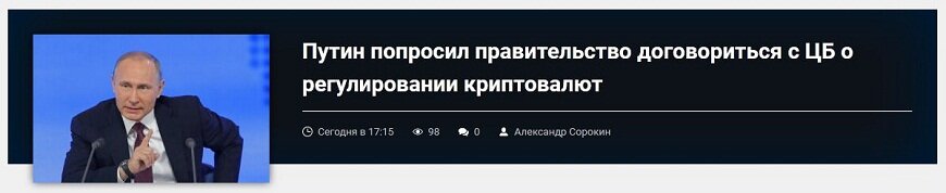 На прошлой неделе ЦБ выпустил доклад, в котором предложил запретить майнинг и организацию обращения криптовалют на территории РФ. Путин отметил, что Банк России «не стоит на пути прогресса и сам предпринимает усилия, чтобы внедрять новейшие технологии в эту сферу деятельности».