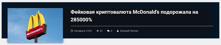 Токен, созданный по мотивам шуточного твита McDonald’s, подорожал более чем на 285000% спустя несколько часов с момента запуска.