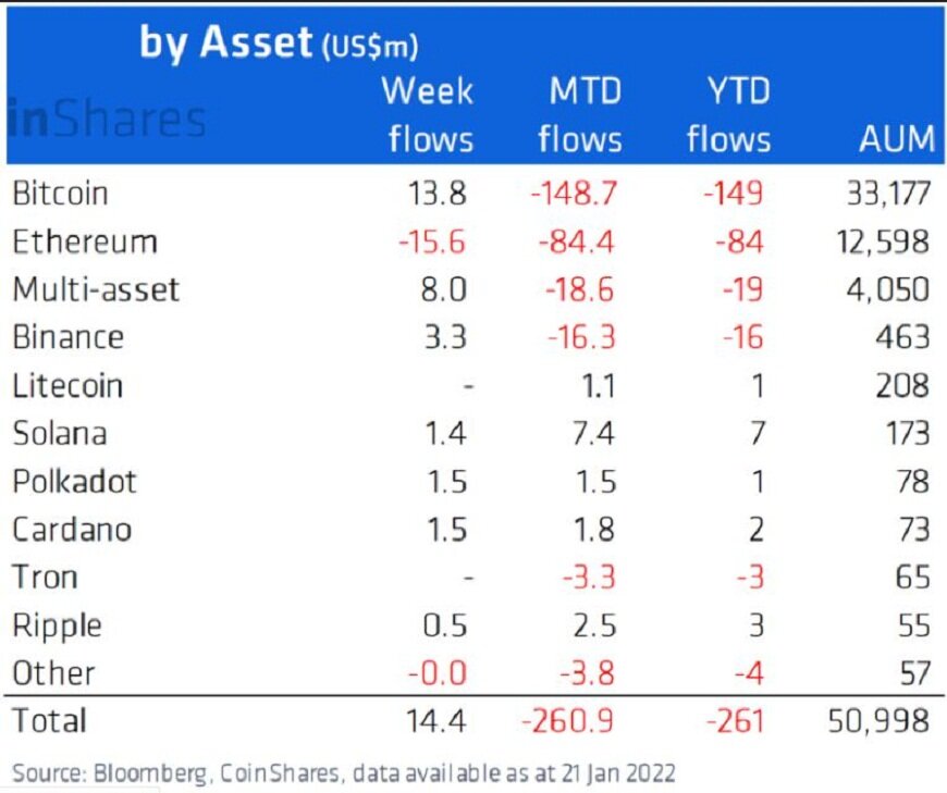 CoinShares, компания по управлению цифровыми активами, опубликовала регулярный еженедельный отчет по движению денежных средств на рынке цифровых активов. Согласно данным за неделю на 21 января, криптофонды и криптовалютные инвестиционные продукты зарегистрировали первый в 2022 году приток капитала.