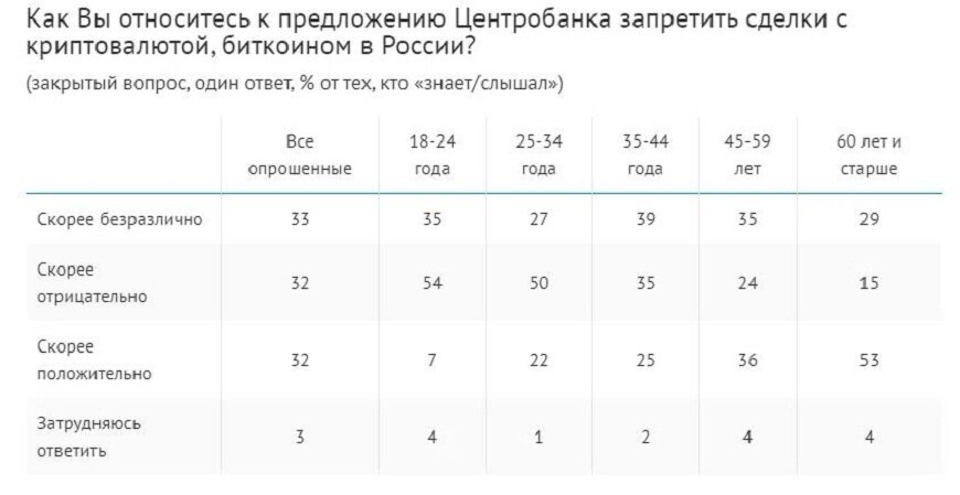 Согласно ВЦИОМ, более 30% опрошенных россиян «поддержали предложение запретить биткоин». Однако как выяснила редакция, больше всего идею Центрального банка РФ по запрету криптовалют одобрили российские пенсионеры — люди с возрастом 60 лет и старше. Из них 53% положительно оценили идею мегарегулятора. Наиболее критичными оказались респонденты в возрасте от 18 до 24 лет. Из них 54% отрицательно отнеслись к призывам ЦБ запретить оборот криптовалют.