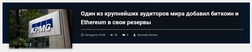Компания KPMG, входящая в «Большую четверку» крупнейших аудиторов мира, объявила о включении биткоина и Ethereum в корпоративные резервы своего канадского подразделения. Это первая прямая инвестиция фирмы в криптовалюты, говорится в пресс-релизе.