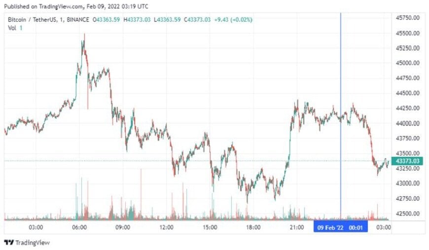 Во вторник, 8 февраля курс биткоина на криптобирже Binance обновил месячный максимум на отметке в $45,4 тыс. Затем стоимость криптовалюты начала снижаться. По состоянию на 8 февраля актив торгуется на уровне в $42,9 тыс., за прошедшие сутки он подешевел на 2%. Несмотря на последнее снижение, с 24 января биткоин подорожал более чем на 30%.