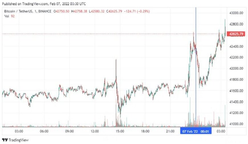 Утром 7 февраля цена биткоина впервые с 20 января достигла $43 тыс. За неделю криптовалюта подорожала на 13%, а ее капитализация увеличилась до $808 млрд, по данным CoinGecko. По состоянию на 11:25 мск актив торгуется по $42,6 тыс.