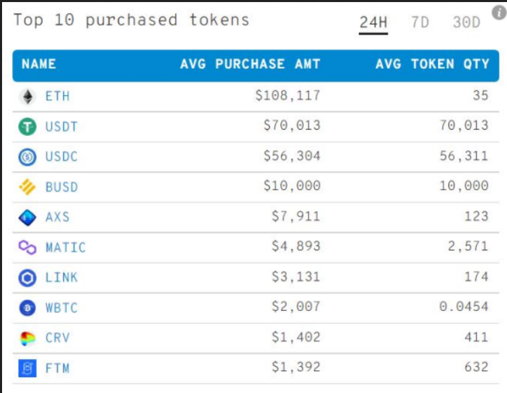За последние 24 часа чаще других покупали токены Ethereum (ETH), Axie Infinity (AXS), Polygon (MATIC), Chainlink (LINK), Curve DAO Token (CRV) и Fantom (FTM), по данным сервиса Whalestats, который отслеживает крупные перемещения криптовалюты. Также в список самых покупаемых альткоинов вошли стейблкоины USDT, USDC, BUSD и «обернутый» биткоин WBTC, предназначенный для обмена ликвидностью между блокчейнами биткоина и Ethereum.