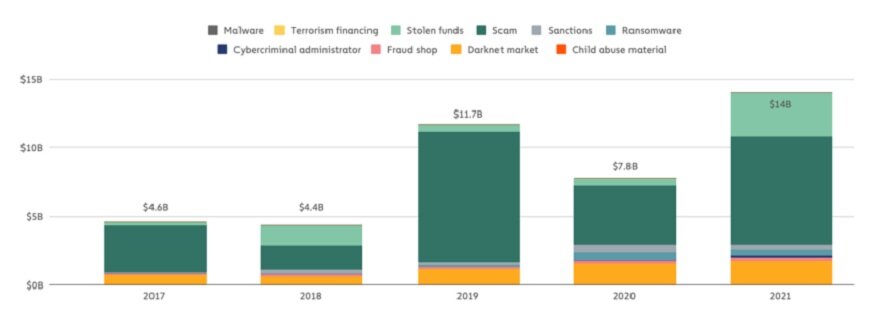 Объем криптовалютных транзакций, связанных с незаконной деятельностью в 2021 году обновил исторический максимум. Об этом пишет Chainanalysis в последнем исследовании, посвященном преступлениям в криптовалютной индустрии. В отчетном периоде на криптовалютные кошельки, связанные с незаконной деятельностью, поступило более $14 млрд, что почти в два раза больше, чем в 2020 году.
