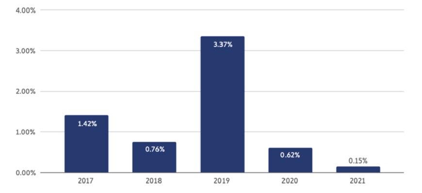 Кроме того, Chainalysis скорректировал долю нелегальных транзакций в общем объеме криптовалютного трафика за 2020 год с 0,34% до 0,62%, объяснив это тем, что со времени публикации были выявлены новые адреса, вовлеченные в криминальную деятельность.