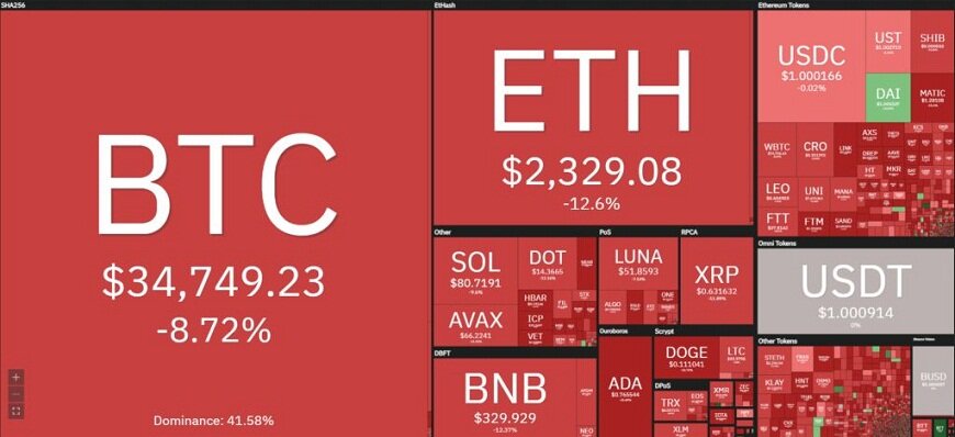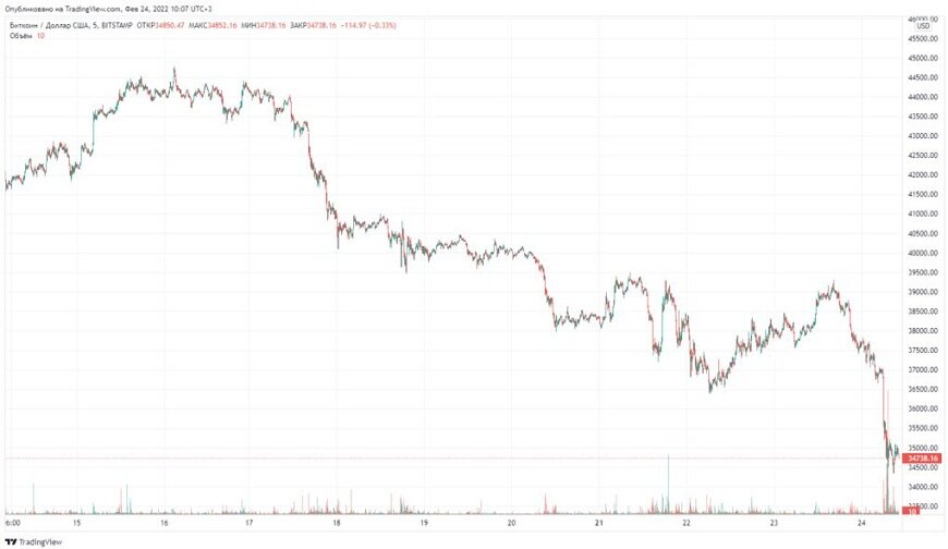 Утром 24 февраля курс биткоина обвалился до $34,3 тыс. На данный момент первая криптовалюта торгуется на уровне в $35 тыс., за прошедшие сутки она подешевела на 8%.