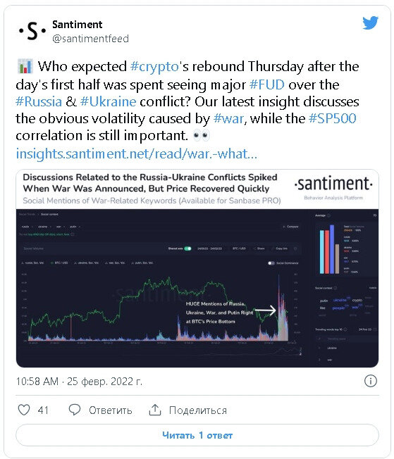 Аналитическая компания Santiment зафиксировала резкий всплеск популярности криптовалют после того, как на Украине началась военная операция, объявленная президентом России Владимиром Путиным. Пока ситуация в регионе не стабилизируется, на крипторынке будет наблюдаться повышенная волатильность, предупредили аналитики.