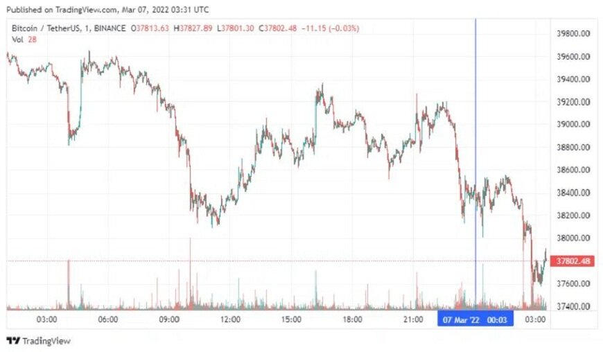 Биткоин (BTC) начал новую рабочую неделю с падения. По состоянию на 06:34 (МСК), криптовалюта торгуется по $37 802. Минимум стоимости биткоина за 24 часа, по данным ресурса CoinMarketCap, зафиксирован на уровне $37 796, максимум – на высоте $39 600.