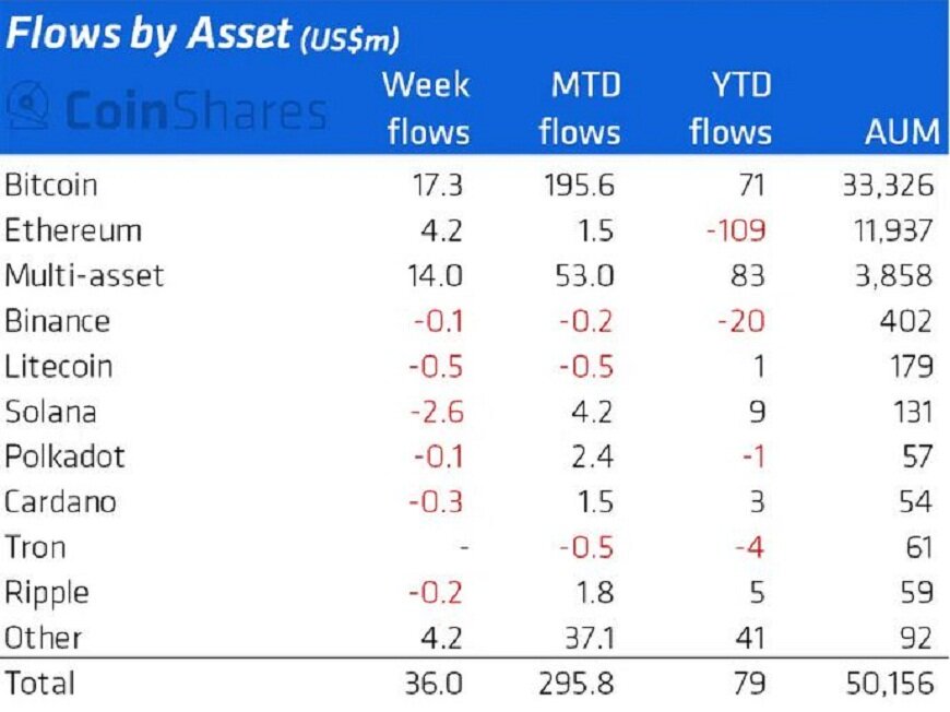Разбивка по отдельным валютам показывает, что инвестиционные продукты на базе биткоина (BTC) привлекли капитал на сумму $17 млн. Это уже пятая неделя в зеленой зоне, и за это время инвесторы влили в биткоин около $239 млн. Приток средств в Ethereum составил скромные $4,2 млн.