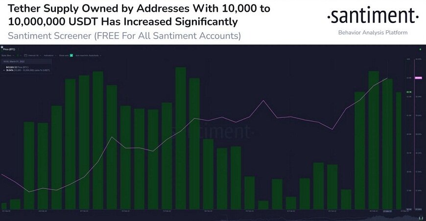 В начале марта аналитики заметили рост объема кошельков с балансом стейблкоина tether от 10 000 USDT до 1 млн USDT. С начала февраля объемы кошельков периодически росли и падали, однако начиная с двадцатых чисел февраля объемы стремительно пошли вверх, обновив месячный максимум.