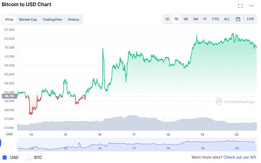 На момент написания ВТС торговался, по данным аналитического ресурса CoinMarketCap, в районе $41 549, c внутринедельным повышением на 7+%.