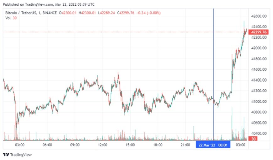 По одним данным, команда Terraform Labs успела закупиться биткоинами на $125 млн. В других источниках пишут о том, что под контроль организации уже перешли BTC на $3 млрд. Не исключено, что действия компании могли стать одной из причин роста курса криптовалюты. Дальнейший закуп биткоинов со стороны Terraform Labs также может поддержать позитивное движение монеты.