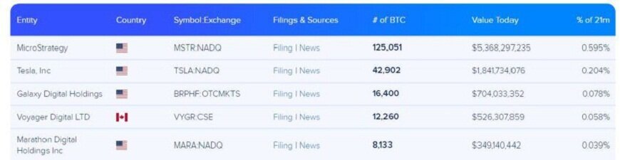 Для сравнения, под контролем крупнейшего инвестора биткоина – поставщика бизнес-аналитики MicroStrategy – находятся монеты на $5,3 млрд. У производителя электрокаров Tesla, по состоянию на момент написания материала, в резервах BTC на $1,8 млрд.
