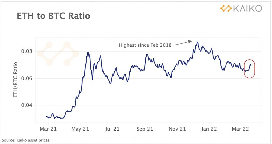 С начала года ETH потерял в цене более 20%. Биткоин же за этот временной промежуток потерял чуть более 10%. Как отмечают в Kaiko, сейчас для стейкинга консенсусного уровня (бывш. Ethereum 2.0) вложено более 10 млн ETH (~$30 млрд). Столь большой объем капитала говорит о растущем доверии инвесторов к обновленной версии сети, считают аналитики.