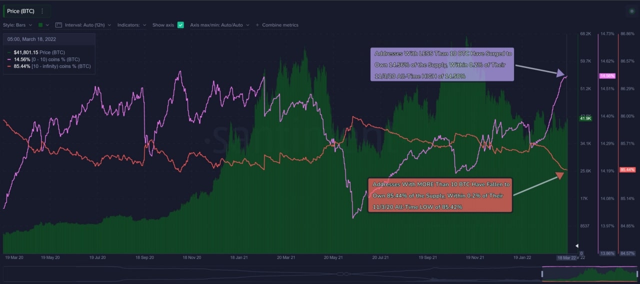 Биткоин-адреса с балансом менее 10 BTC непрерывно накапливают монеты с мая 2021 года, приближаясь к историческому максимум в 14.56% от всего объема предложения