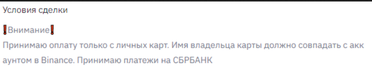 Чтобы обойти новые ограничения, продавцы Binance P2P пока негласно условились использовать опцию «Переводы через конкретный банк». Здесь по-прежнему можно найти предложения с использованием карт Сбербанка, ВТБ и т.д. Некоторые продавцы используют альтернативные обозначения, например «СБРБАНК», «СБ» или «Зеленый банк».