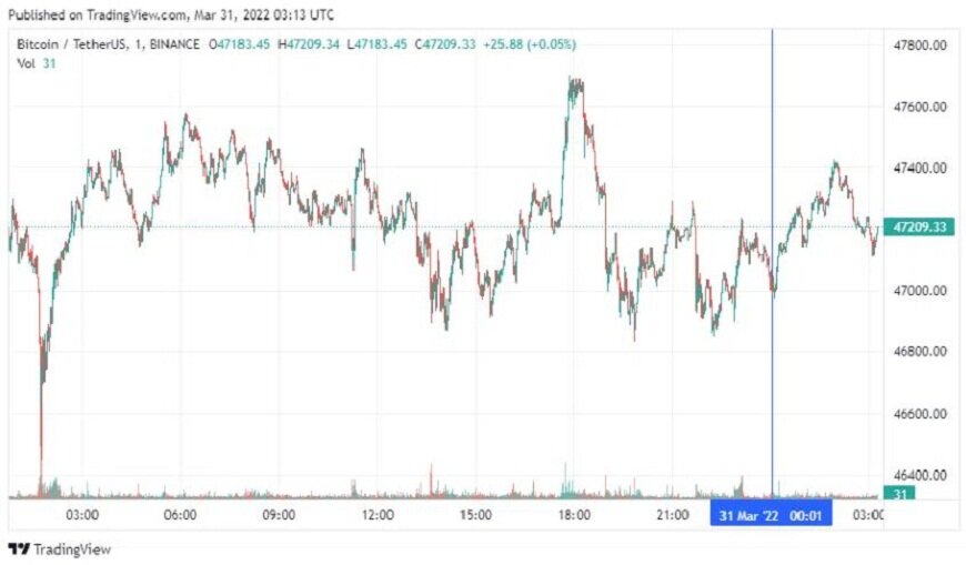 Биткоин (BTC) начал четверг с небольшого роста в рамках бокового движения. По состоянию на 06:14 (МСК), криптовалюта торгуется по $47 209. Минимум стоимости монеты за 24 часа, по данным ресурса CoinMarketCap, зафиксирован на уровне $46 913, максимум – на высоте $47 655.