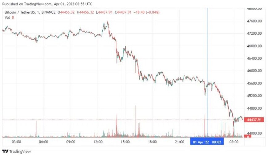 В пятницу, 1 апреля курс биткоина на криптобирже Binance падал до $44,2 тыс. По состоянию на 10:05 мск первая криптовалюта торгуется на уровне в $44,8 тыс., за прошедшие сутки она подешевела на 5%. Капитализация криптовалюты сократилась до $850 млрд при объемах торгов за 24 часа в $39 млрд.