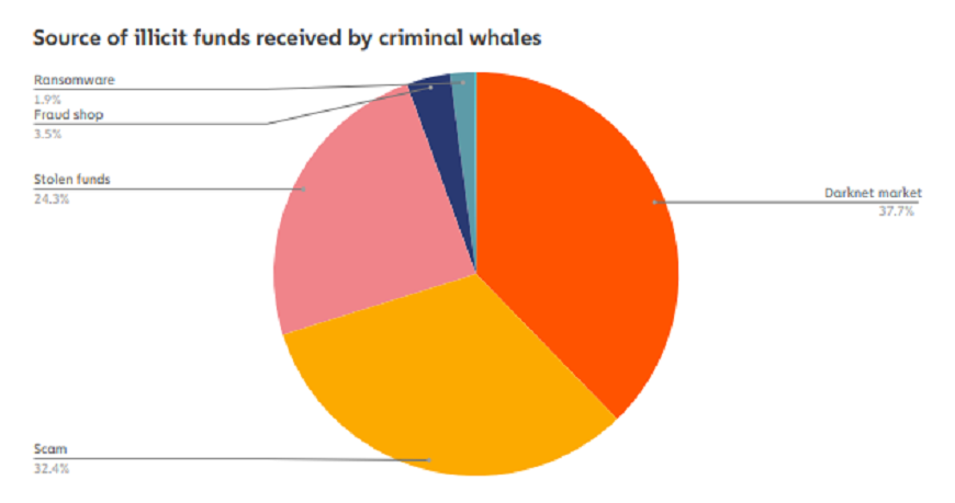 Под грязными адресами в Chainalysis подразумевают даркнет, скамы, похищенные деньги и программы-вымогатели. Наибольшим источником грязных денег на момент написания материала остается даркнет. Оттуда поступает примерно 38% на кошельки криминальных китов. Еще 32% от скама и 24% украденной криптовалюты.
