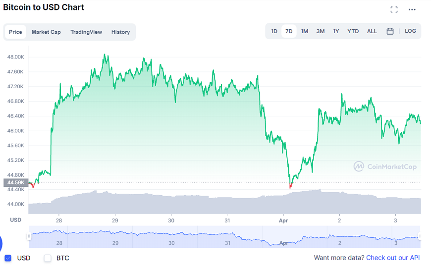 3 апреля биткоин торгуется на уровне в $46,3 тыс., за прошедшую неделю он подорожал на 4%. В то же время цена Ethereum выросла на 11% и достигла $3,48 тыс. Общая капитализация рынка увеличилась до $2,3 трлн.